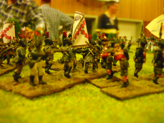 Anyway, my boys were performing herculean tasks with ease and Quinny headed straight for the village building with the flag, while Tim and Geoff were bringing up their infantry expecting to have to muscle Quinny out of the way. Garry was still some distance away due to being slowed down by Geoff's dragoons, but after knocking a couple of figures off with his artillery, managed to break the dragoons with infantry fire from the edge of a wood. Geoff had also got his light infantry into the village by running them in skirmish order around the far, undefended, side of the village. He then had the job of playing 'find the thimble' in the village, but Quinny had ensconced himself in the correct building giving the French no chance to evict him before turn 12.